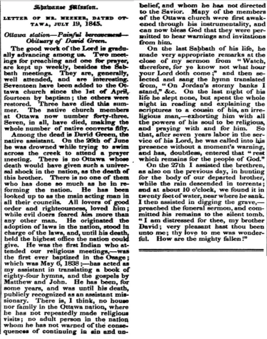 In 1837, Baptist Missionary Jotham Meeker and his wife began missionary work among the recently removed Ottawas. The next year, David Green converted to Christianity. Green, Thomas Wolfe (Wa-wish-qua), Lewis King (Pe-mat-se-win), and other early Ottawa converts aided Meeker in translating hymns and portions of the gospel into the Ottawa language. In 1838, these were printed as the Ottawa Frist Book. In November 1839, Meeker appointed Green assistant missionary, and slowly, greater numbers of Ottawas embraced Christianity. As a result, the Ottawa Indian Baptist Church gradually became a central institution in tribal life