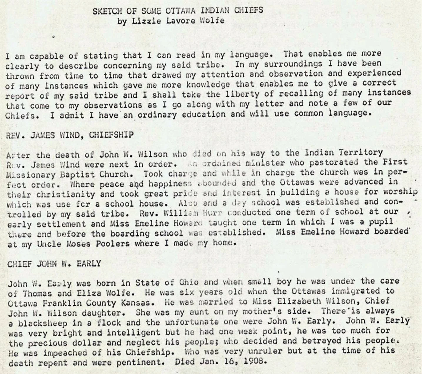Capable of speaking and reading the Ottawa language, Wolfe taught the language to her grandson, Clarence King, and by the time he became chief in the 1960s, Clarence was one of the last conversant speakers among the Oklahoma Ottawas.