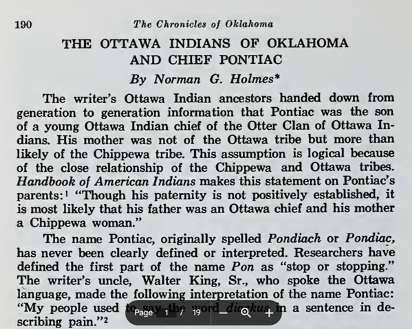 In addition to his government work, Holmes was an accomplished historian. He published the article “The Ottawa Indians of Oklahoma and Chief Pontiac” in the Chronicles of Oklahoma in 1967 and later contributed his research for the book The Ottawa Indian Tribe of Oklahoma: Past, Present, Future (1981).