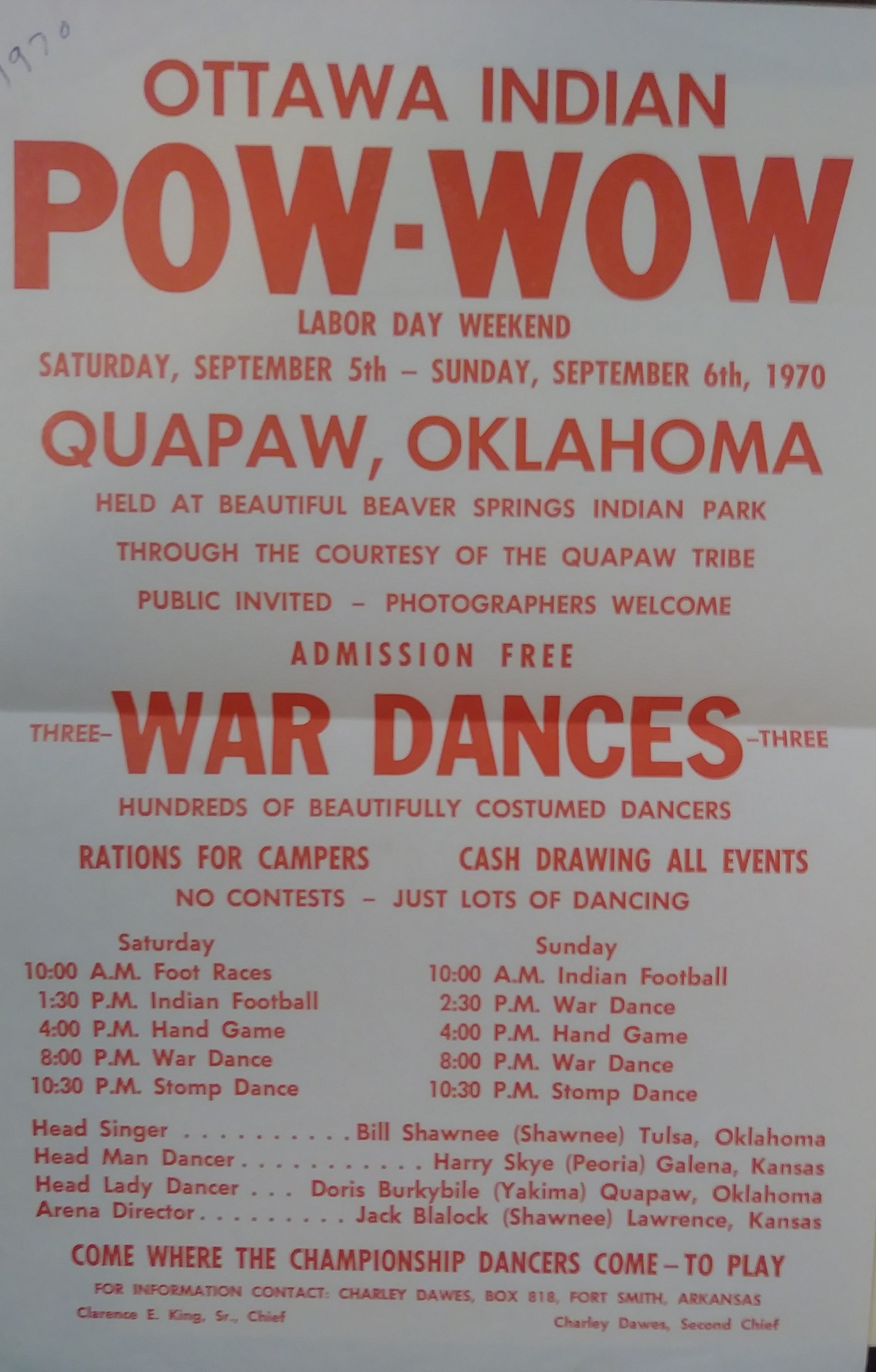 The event was scheduled over Labor Day weekend to allow far-flung tribal members to attend, and the event also served as a back-to-school dance for Ottawa youth. Without a tribal land base on which to host it, organizers secured permission to use Beaver Springs Indian Park in Quapaw, Oklahoma. The early powwows operated on limited funds and relied heavily on volunteer labor and community donations. Borrowed equipment and raffles of donated items sustained the event in its early years.
