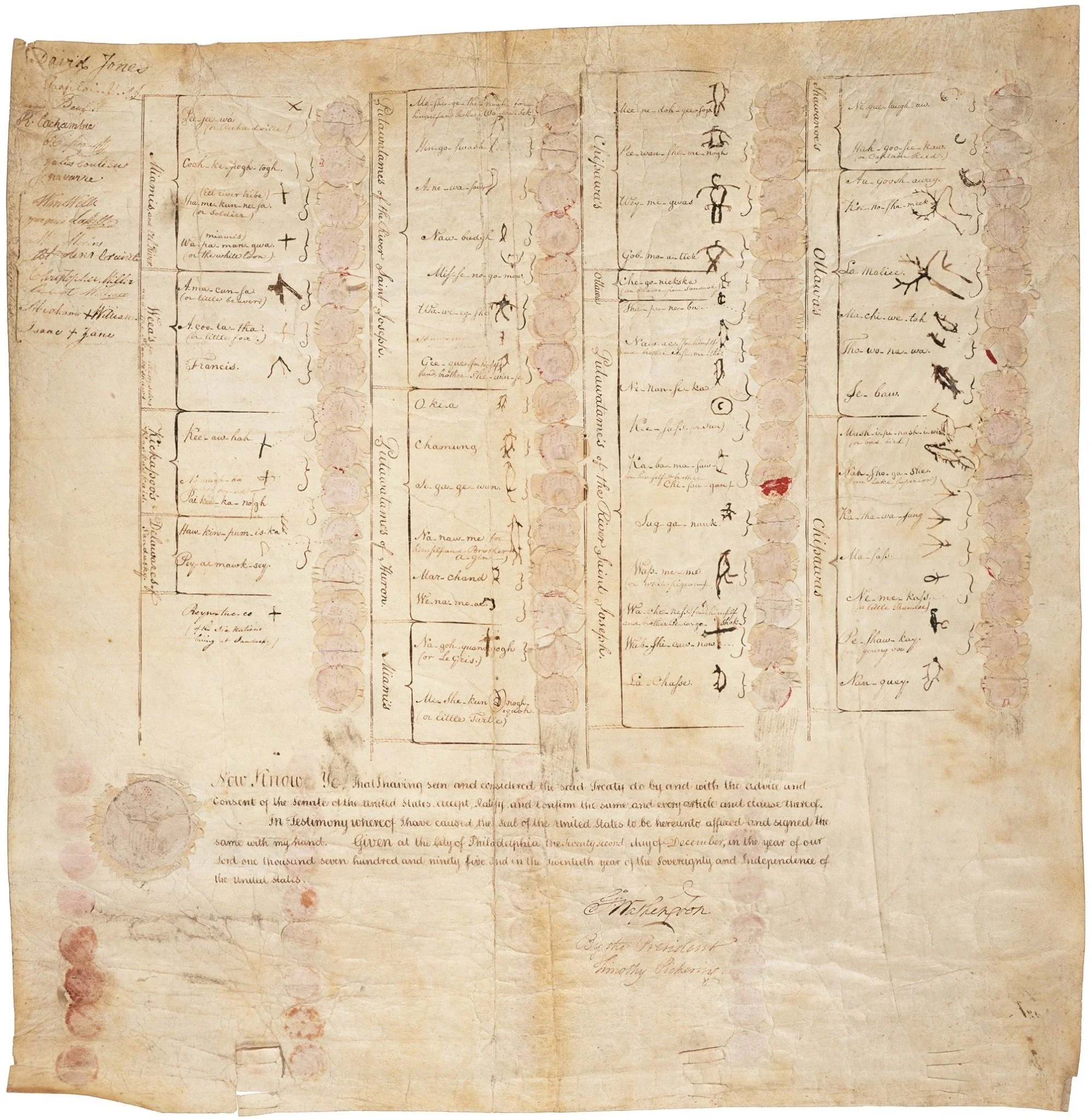 The head Ottawa signatory was Au-goosh-away (or Egushawa)—a powerful war leader regarded as the successor to Pontiac. Although in his sixties, Au-goosh-away actively participated in the Battle of Fallen Timbers and suffered severe injuries.