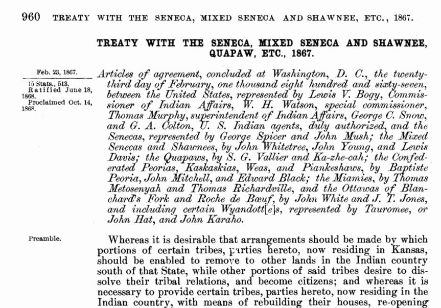 The Ottawa Treaty of 1867 formalized Ottawa relocation from Kansas to Indian Territory (present-day northeastern Oklahoma). The treaty ratified an agreement between the Ottawa and the Shawnee in which the Ottawas purchased approximately 15,000 acres from the Shawnee Tribe at a cost of one dollar per acre. Federal officials characterized the agreement as government approval of arrangements already negotiated between the tribes.