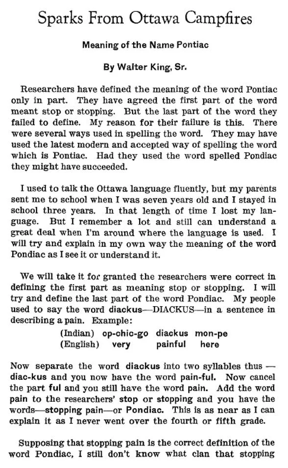In addition to forging tribal connections, Walter established relationships with academics interested in Ottawa history. In the 1950s, Walter published some of his research in the journal Northwest Ohio Quarterly. He authored an article on the meaning of the name Pontiac drawn from his knowledge of Anishinaabemowin and published a Nanabozho story told to him by his great-grandmother Eliza Wolf when he was a child. Through his writings, Walter recorded many memories, traditions, and historical episodes that would otherwise have been lost.